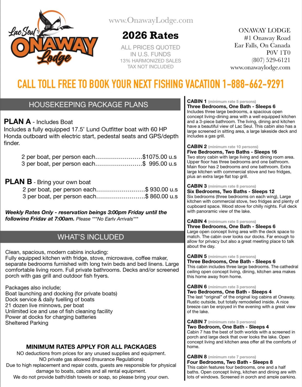 Please note that we have not had a rate increase in several years, despite significant increases in expenses such as fuel, insurance, replacement equipment, labor and many upgrades to our facilities. It has always been our intention to offer only the finest for your fishing vacations while at an affordable cost. Effective for the 2026 season, we again will not be increasing our rates, however any boat gas will no longer be included in the packages. We will continue to fuel each boat daily, and as always, have a large supply of fresh live minnows available in the boathouse.